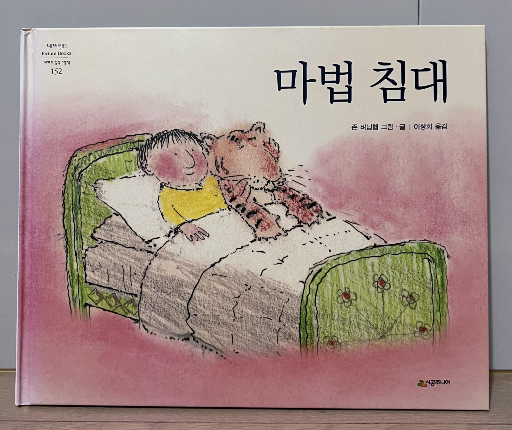 <마법 침대>도 현실 세계와 상상의 세계를 오가면서 이야기가 진행이 됩니다. 이 이야기의 주인공은 조지입니다. 이 이야기의 시작의 조지의 침대를 사는 것에서 출발합니다. 새로운 친대를 찾고 있는 조지에게 중고 매장이 눈에 띄고 그곳에서 새로운 침대를 만나게 됩니다. 바로 표지에서 만난 초록색 침대입니다. 이 침대를 사용하기 위해 구석구석 닦는데 이상한 글씨를 봅니다. 바로 이 침대에 누워 주문을 외우면 여행을 할 수 있다는 말입니다. 하지만 주문은 '엄'이라는 글자밖에 없었습니다. 조지는 침대를 맞이한 첫날 일찍 잠자리에 듭니다. 그리고 '엄'으로 시작하는 여러 주문을 외우지만 마법 여행에 실패합니다. 그리고 다음날 다시 한번 주문을 알아내려고 애씁니다. 그리고 자기도 모르게 주문을 외우게 되고 여행을 떠납니다. 난쟁이와 요정들을 만나게 됩니다. 하지만 가족들에게는 이 이야기를 하지 않고 계속 여행을 떠납니다. 여행 중에 아기 호랑이를 만나게 되는데 이 아기 호랑이가 바로 표지에 등장한 호랑이입니다. 조지는 아기 호랑이를 침대에 태워 부모님을 찾아 주게 됩니다. 그 후로도 여행은 계속되고 해적도 만나고 마녀들도 만납니다. 그리고 조지는 가족과 휴가를 떠나게 되고 돌아온 이후 침대는 사라져 있습니다. 침대가 버려졌다는 사실은 안 조지는 침대를 찾아 나서고 다시 침대와 함께 여행을 떠나게 됩니다.