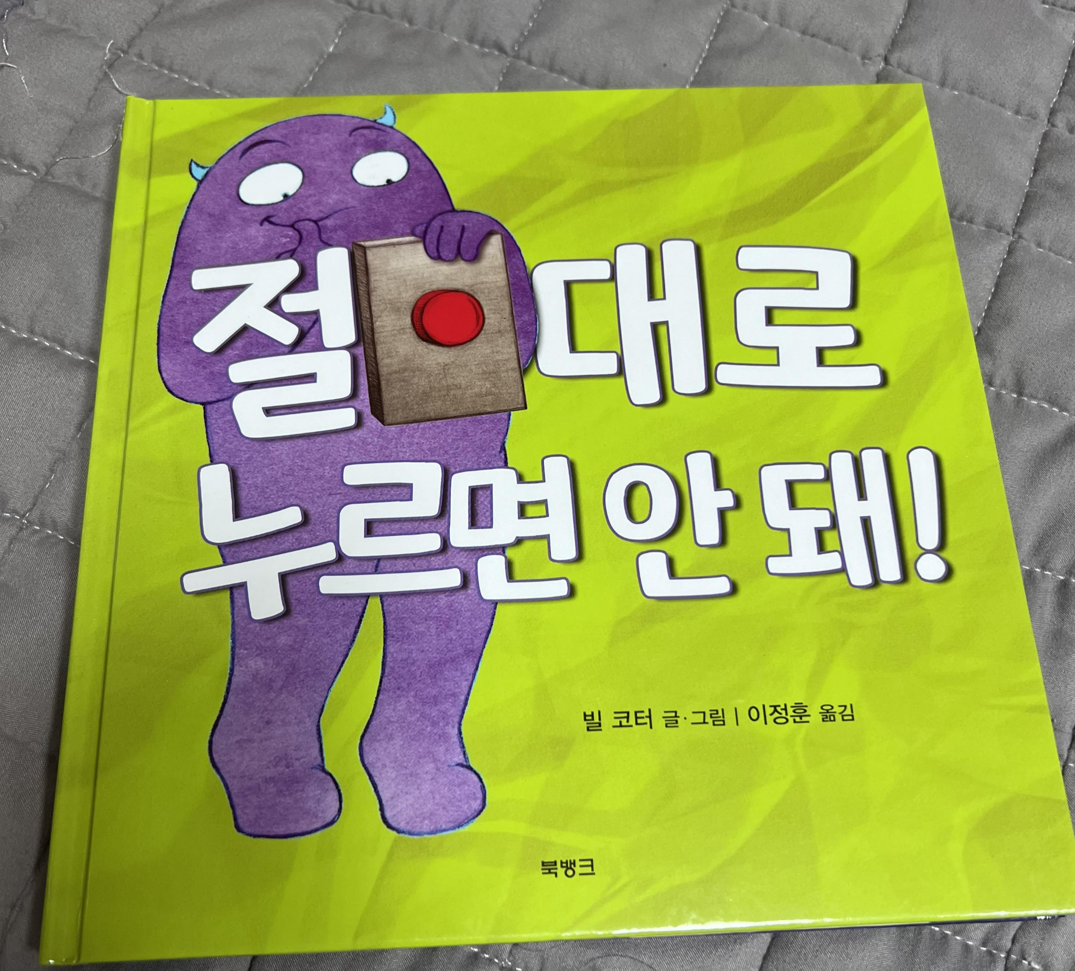 책 표지에는 보라색 생명체가 있습니다. 머리엔 뿔도 있습니다. 그리고 이 생명체는 빨간 동그라미 버튼을 들고 있습니다. 그리고 책 제목이 아주 크게 쓰여 있습니다. <절대로 누르면 안 돼!>라고 말입니다. 사람의 심리는 참 이상합니다. 별 생각이 없다가도 절대로 하지 말라고 하면 꼭 하고 싶어 집니다. 그림만 볼 때는 버튼에 대한 생각이 없는데 제목을 읽는 순간 '눌러볼까' 싶어집니다. 아이도 역시 그랬습니다. 그림만 찬찬히 볼 때는 그냥 빨간 동그라미가 있다고 말했습니다. 제가 제목을 읽으니 손이 스르르 빨간 버튼 위로 올라갔습니다. 과연 빨간 버튼을 누르면 무슨 일이 일어나기에 절! 대!로! 누르지 말라고 하는 것인지 궁금해집니다.