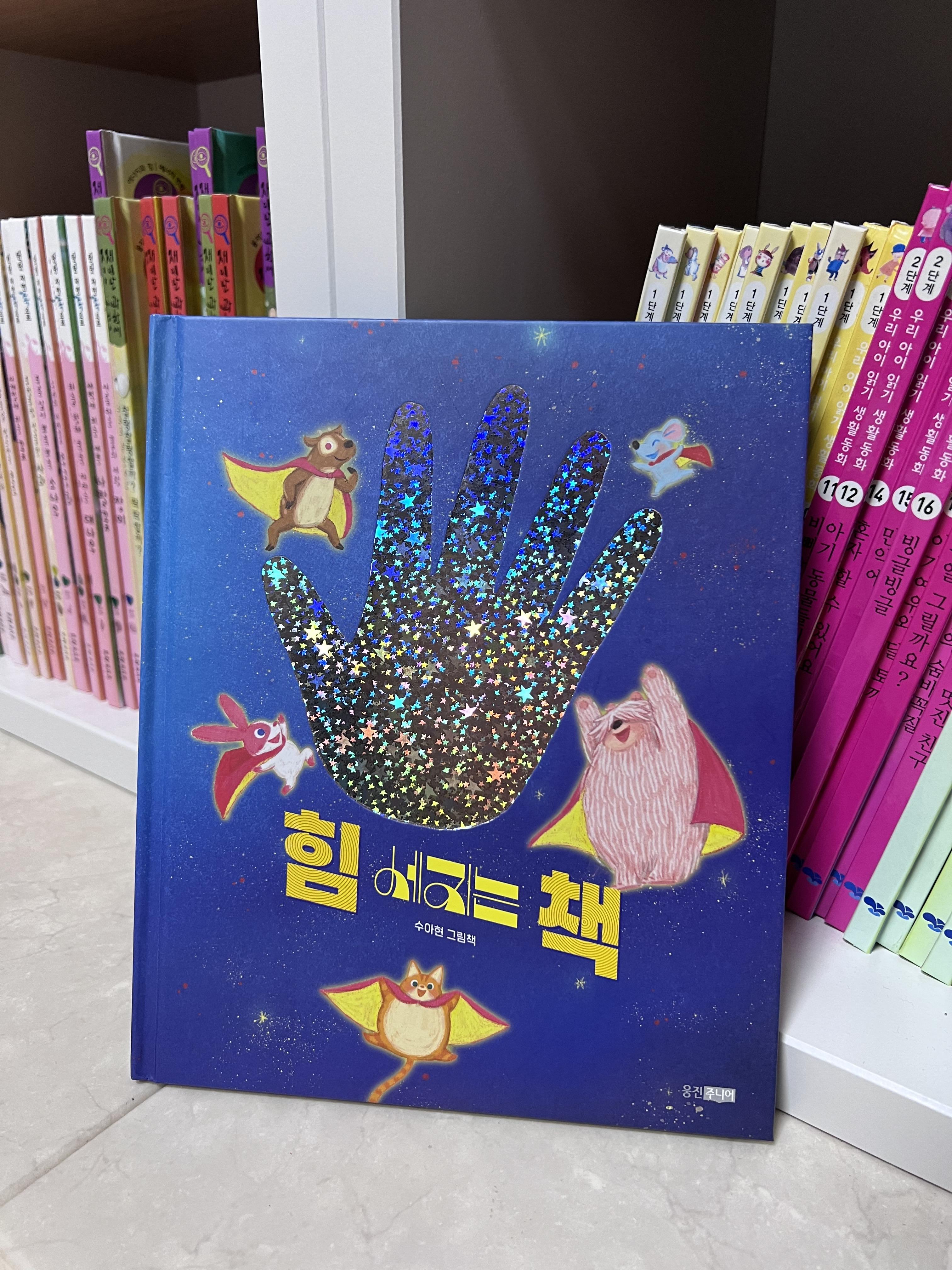 이번 북스타트에 포함된 도서는 바로 <힘 세지는 책>입니다. 책의 표지에는 반짝반짝 빛이 나는 홀로그램 손이 있습니다. 그리고 그 주변에는 토끼와 날다람쥐, 곰이 있습니다. 손이 표지의 절반을 차지하고 있습니다. 과연 이 손의 의미는 무엇일지 궁금해집니다.
