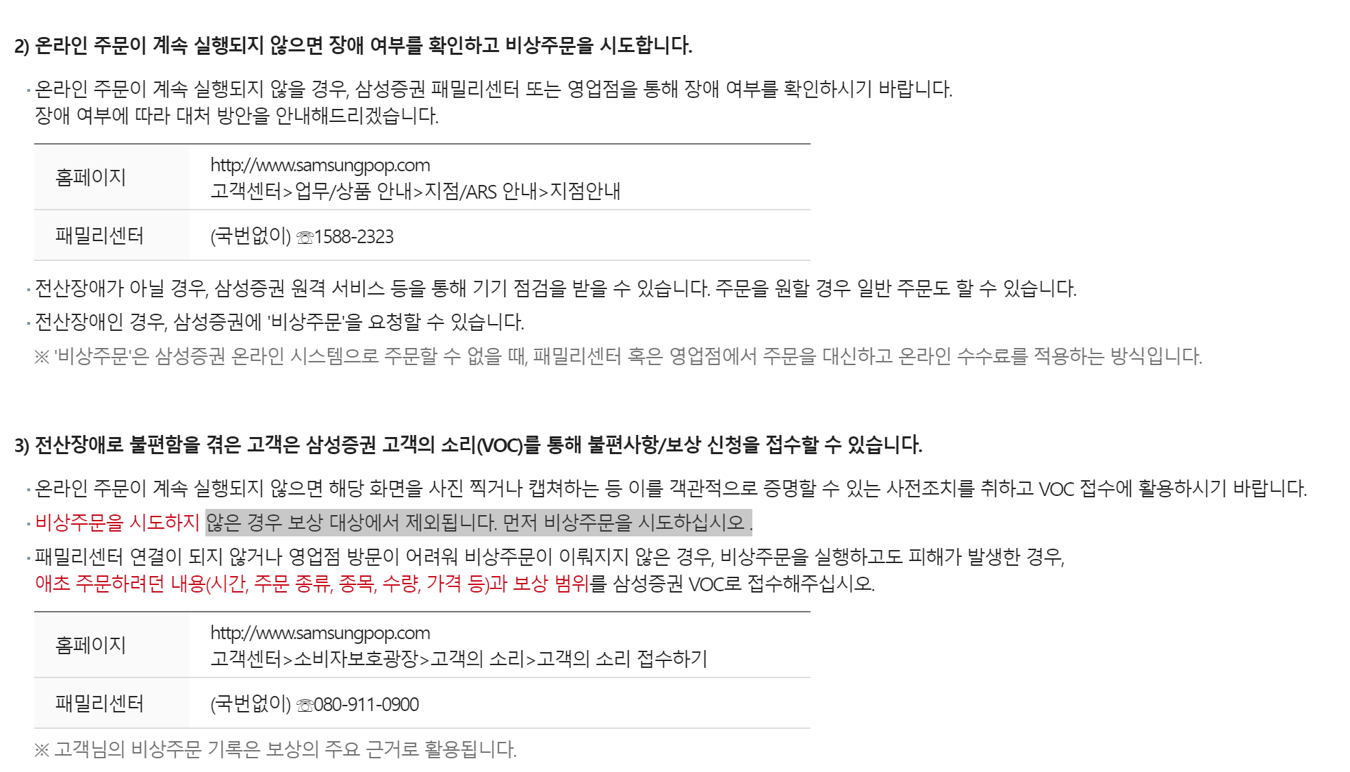 그래서 삼성증권에서는- 영업점 방문이 어려워서 비상 주문을 하지 못한 경우- 패밀리 센터에 전화 연결이 어려워 비상 주문을 하지 못한 경우- 비상 주문을 했지만 피해가 발생한 경우