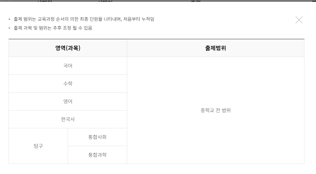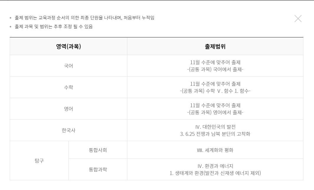 수학은 공통과목 수학에서 도형의 방정식까지가 시험 범위입니다.